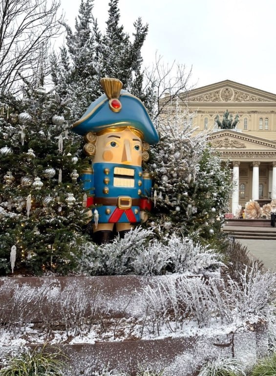 🎄Зимний сад Щелкунчика у Большого театра На площади перед театром развернулась сказочная композиция: живые ели и сосны, украшенные в стиле балетной сцены, сочетаются с декоративными элементами — гигантскими шоколадными солдатиками, сахарными тросточками, часами с движущимися стрелками и светящимися снежинками. Центром композиции стал «дворец Мышиного короля», стилизованный под декорации легендарной постановки 1919 года. Особое внимание уделено атмосфере погружения: звучит аранжированная музыка из балета, а по вечерам включается динамическая подсветка, имитирующая падающий снег. Для гостей подготовлена интерактивная зона: можно сфотографироваться в костюмах героев балета или «запустить» в небо цифровую снежинку через QR-код — её имя появится на экране у фасада театра. ИНТЕРЕСНАЯ МОСКВА