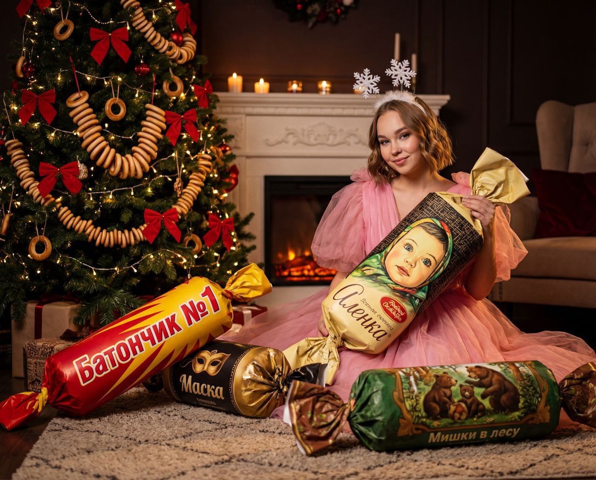 Новогодняя фотосессия для девушки Фотореалистичная тёмная праздничная сцена в роскошной гостиной: большая украшенная рождественская ёлка украшенная красными бантами и баранками и сушками с тёплыми желтоватыми огоньками слева, на камине маленькие горящие свечи, глубокие тёплые тени и мягкий боковой свет, создающий объём. В центре эта девушка с волнистыми русыми каштановыми волосами каре в розовом пышном новогоднем платье,на голове у нее ободок карнавальный со снежинками, вокруг — гигантские завернутые конфеты ( Батончик №1: яркая современная упаковка, красно-жёлтые акценты, крупная надпись №1, динамичный дизайн. Аленка: девочка в платочке, тёплые мягкие тона, классический советский стиль, фирменный «Красный Октябрь». Маска: театральная маска на тёмном фоне, контраст золота и чёрного, винтажный драматичный стиль. Мишки в лесу: медвежата среди хвойного леса, природные зелёно-коричневые оттенки, мягкая сказочная иллюстрация) выглядит как настоящие конфеты только увеличенные.Видна текстура