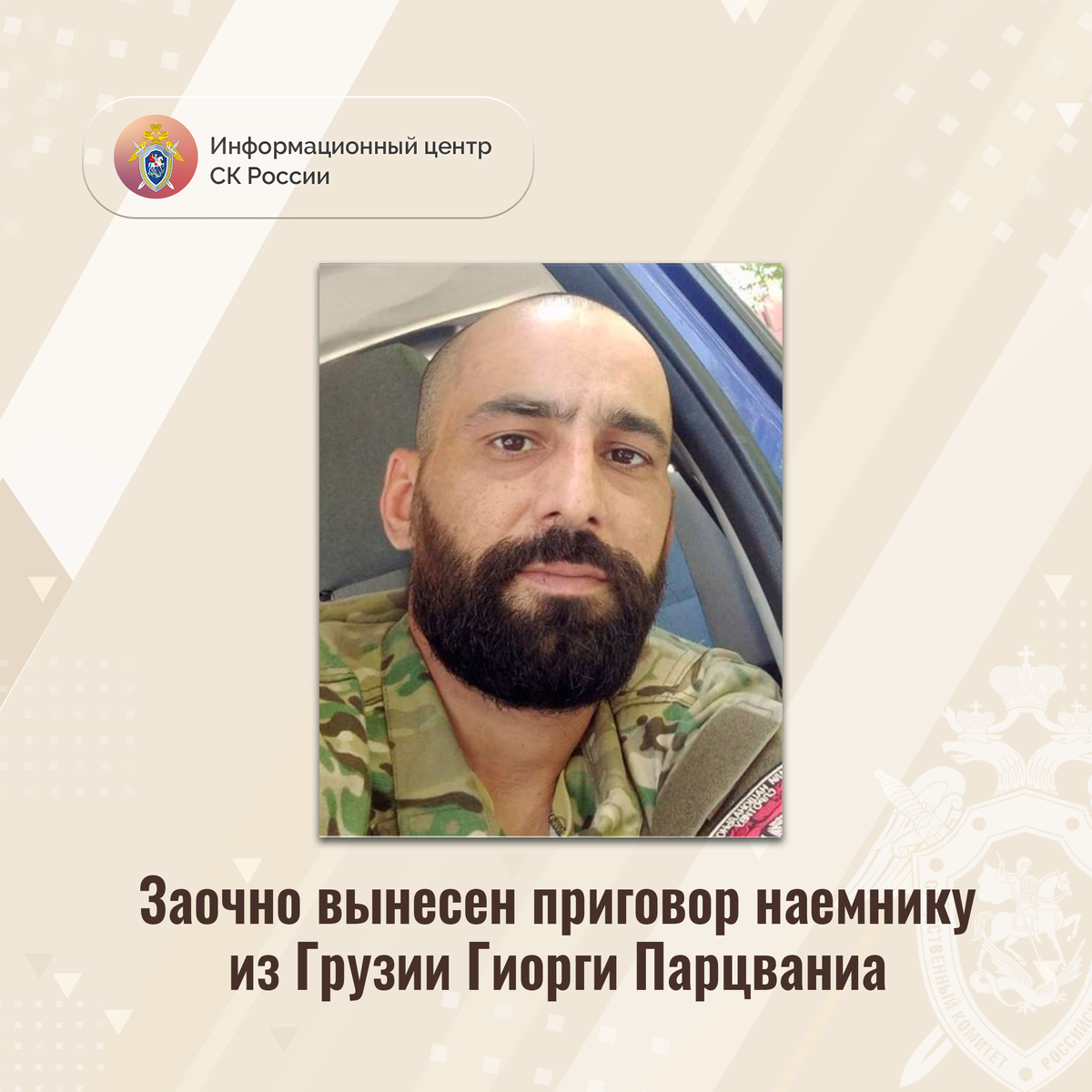 Заочно вынесен приговор наемнику из Грузии Гиорги Парцваниа Собранные Главным следственным управлением Следственного комитета Российской Федерации доказательства легли в основу приговора, вынесенного судом заочно в отношении гражданина Грузии Гиорги Парцваниа. Он заочно признан виновным в совершении преступлений, предусмотренных ч. 3 ст. 359 УК РФ (участие наемника в вооруженном конфликте – два эпизода), п. «а» ч. 2 ст. 205 УК РФ (террористический акт), ч. 3 ст. 322 УК РФ (незаконное пересечение Государственной границы Российской Федерации), ч. 4 ст. 222 УК РФ (незаконные перевозка, ношение, хранение огнестрельного оружия, его основных частей и боеприпасов к нему, совершенные организованной группой), ч. 4 ст. 222.1 УК РФ (незаконные ношение, взрывных устройств, совершенные организованной группой), ч. 3 ст. 226.1 УК РФ (контрабанда огнестрельного оружия, боеприпасов, совершенная организованной группой). По версии следствия, в период с 2014 по 2017 год, а также с февраля 2022 года Парцв