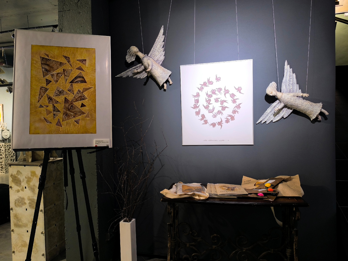 Мы с художником спустились на цокольный этаж и погрузились в «Ангеломанию». Автор показал мне две самые «свежие» работы. Они были готовы в декабре, буквально накануне этой выставки 👇