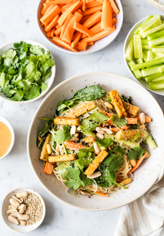 Свежесть в тарелке способна многое — особенно в холодное, серое время года, когда всё вокруг напоминает забытый сериал на паузе. Этот салат — как визуальная медитация: яркий, хрустящий, и с лёгким привкусом «всё будет хорошо». Фунчоза: лапша, которая не усложняет жизнь Прозрачная, почти невесомая лапша из бобов мунг — не капризная, готовится за 5 минут и отлично дружит с овощами. Без глютена, с растительным белком и клетчаткой — подходит даже тем, кто привык читать состав на упаковке, как криминальный роман. Овощи и темпе: сочетание, которое звучит модно, а на вкус — сытно В составе — простые и в то же время уместно изысканные ингредиенты: тонко нарезанная морковь, свежий огурец, молодой шпинат, и темпе — ферментированный продукт из соевых бобов с внезапно приятным вкусом и хорошей текстурой. Темпе богат белком и пробиотиками, при жарке сохраняет форму и не ведёт себя как капризный ингредиент. Идеален в тёплых салатах и чувствует себя уверенно даже без маринада. Арахисовый соус: завер