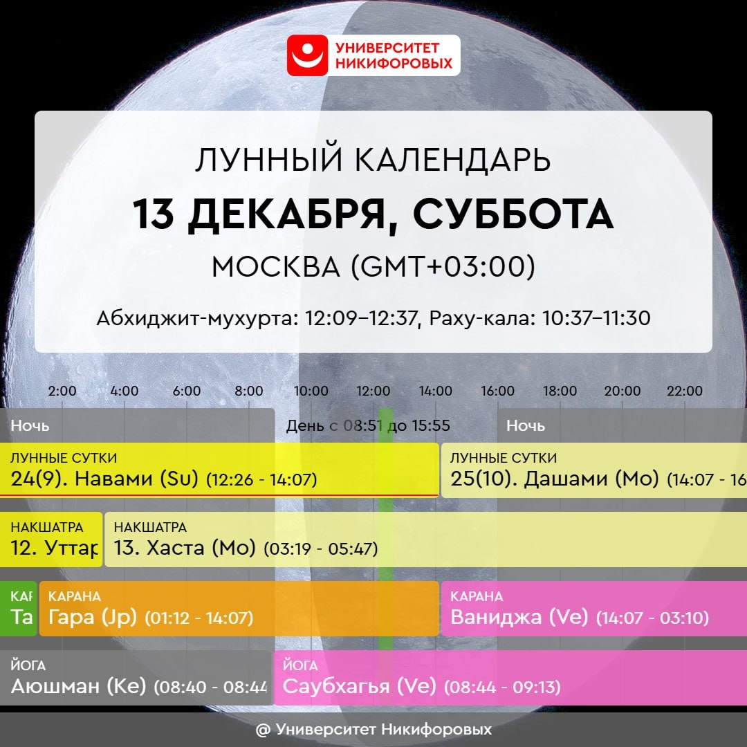 13 ДЕКАБРЯ, СУББОТА До 14:08 преобладает энергия “пустых рук” – момент, когда благоприятно отдавать, делиться с другими, жертвовать. Особенно благоприятно сегодня послужить кому-то собственными руками: помочь физическим трудом, выполнить какую-то работу, сделать кому-то массаж. Хорошее время для домашней работы и рутинных дел, в том числе тех, которые требуют ловкости и сноровки. Можно заниматься учебой и обучением – ум будет цепким и одновременно интуитивным. Занятия и репетиции пройдут плодотворно. Вторая половина дня, после 14:08, несет более конструктивную энергию, она дает возможность обрести желаемое – получить прямо в руки. Подходящий момент для занятий искусством и ремеслами, а также для торговли и обмена. Можно запланировать встречу с друзьями, весело провести время за настольными играми или организовать совместный просмотр комедии. Юмор – то, что поддерживает в любых жизненных ситуациях. Хорошо будет уделить внимание комнатным растениям – полить, подкормить, пересадить