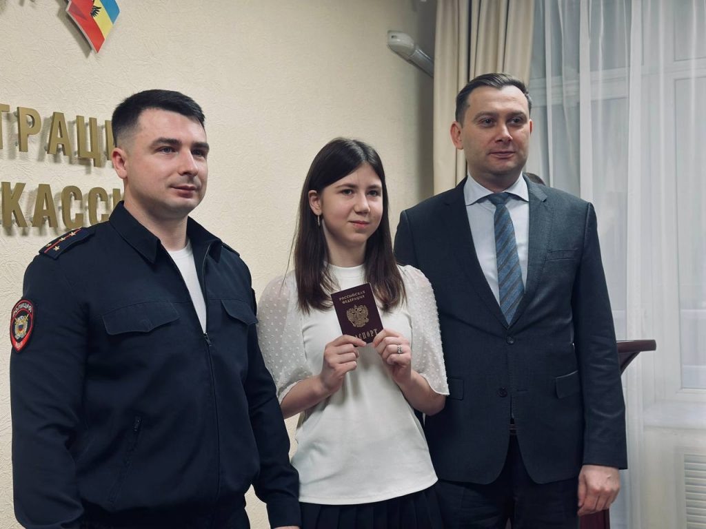 В Новочеркасске сложилась добрая традиция — в День Конституции РФ в торжественной обстановке вручать первые паспорта школьникам, отличившимся в учебе, спорте, творчестве и общественной деятельности. В этом году честь получить важный документ из рук главы города Павла Исакова и инспектора по вопросам миграции межмуниципального управления МВД России «Новочеркасское» Богдана Маяка выпала 8 юным новочеркасцам. «Для вас это по‑настоящему важный шаг во взрослую жизнь. Сегодня вы получили свой главный документ — паспорт гражданина Российской Федерации. Это не просто книжка с данными, это символ новой ответственности и новых возможностей», — обратился к ребятам Павел Исаков. Поддержали подростков в столь волнительный день родители и близкие. Каждому школьнику вместе с паспортом вручили экземпляр Конституции РФ. Фото: Екатерина Евдокимова