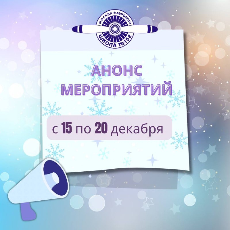 🗓️Анонс мероприятий Дорогие ученики! План мероприятий с 15 по 20 декабря! ⬇️ 📍1-я Аэропортовская, д.1 16 декабря 🔸Семейный фестиваль «Там, где всегда тепло» 19 декабря 🔸Московское кино в школе 20 декабря 🔸Новогодний спектакль театральной студии «Замок Кентервиль» 📍Константина Симонова, д.3 15 декабря 🔸Открытие Новогодней почты 18 декабря 🔸Активные перемены: декорирование лошадки 19 декабря 🔸Новогодний спектакль театрального кружка для 4-х классов 📍Ленинградский пр-кт, д.46 17 декабря 🔸Активные перемены: составление коллажа «Пожелания к Новому году» 🔸Новогодние истории 18 декабря 🔸Квест «Подвиг народа» 19 декабря 🔸Квест «Подвиг народа» ❗️❗️❗️❗️ Всероссийская олимпиада школьников Муниципальный этап 17 декабря 🔸Искусственный интеллект ➖➖➖➖➖➖➖➖➖➖ ‼️Школа 152 теперь и в МАХ #ШколаВоплощающаяМечты #Школа152 #ДОНМ