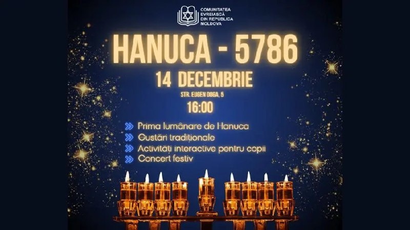 Еврейская община Республики Молдова отметит праздник Ханука – Праздник огней – публичным мероприятием, организованным в Кишиневе. Церемония зажжения первой свечи состоится 14 декабря 2025 года в 16:00 на пешеходной улице в центре столицы. Ханука — один из важнейших праздников в еврейской традиции, символизирующий победу света над тьмой, веры и идентичности над угнетением. В течение восьми дней зажигается одна свеча в память о чуде, лежащем в основе этого праздника, и как выражение надежды, единства и солидарности. Организаторы подчеркивают, что проведение церемонии в общественном месте призвано способствовать открытости, межкультурному диалогу и демонстрации традиций общины. Ханукальный свет представлен как универсальное послание о взаимном уважении, социальной сплоченности и важнейших ценностях демократического и инклюзивного общества. Мероприятия, посвященные Хануке, организованы Еврейской общиной Республики Молдова в партнерстве с Посольством Государства Израиль в Республике Молд