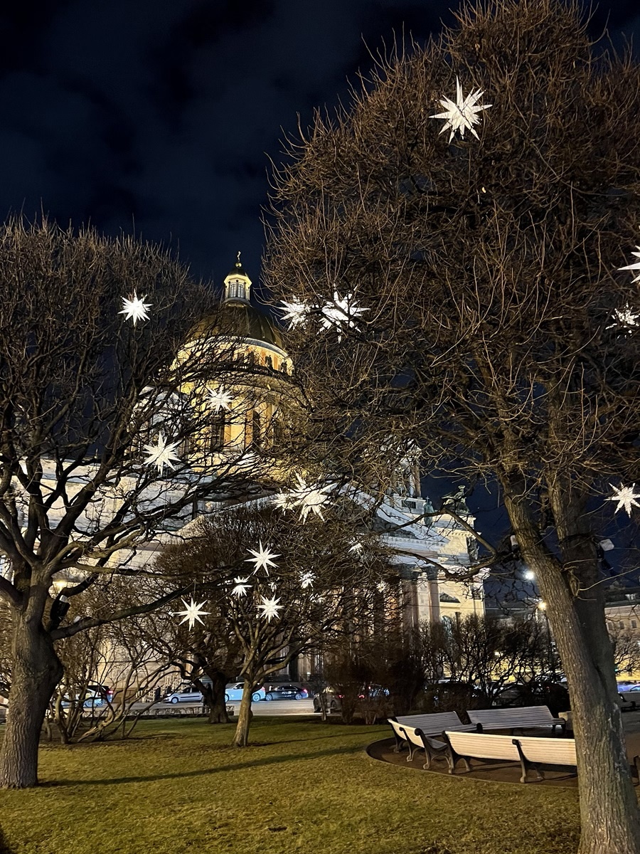 Вокруг Исаакиевского собора разворачивается масштабная световая инсталляция: милая елка, гернгутские звезды, светящиеся обручи и трубы, напоминающие орган. А совсем рядом — на Синем мосту — «расцветает» огнями сад с елочками, гигантскими лотосами и причудливыми арками.