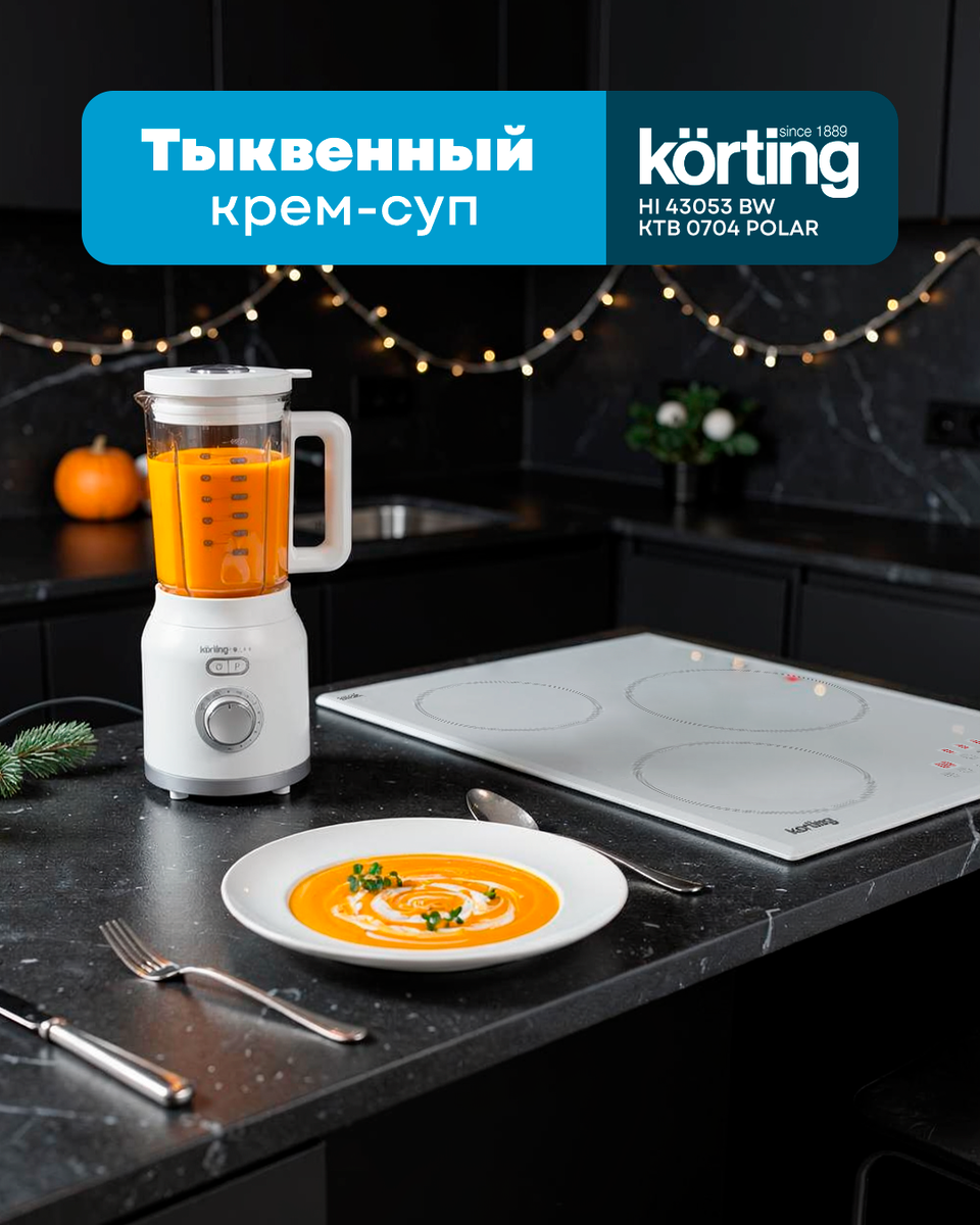 Тыквенный крем-суп с кокосовым молоком — это блюдо, которое сочетает сладость тыквы и мягкую сливочную текстуру. Кокосовое молоко придаёт супу нежность, а специи подчёркивают вкус и аромат овощей. Приготовление: 🥣 Очистите тыкву, удалите семена и нарежьте кубиками. Морковь и лук-шалот нарежьте мелкими кубиками, чеснок измельчите. ♨️ Поместите овощи в кастрюлю на индукционной варочной панели Korting HI 43053 BW, добавьте карри, лавровый лист, соль и перец. Залейте водой на 2/3 объёма и варите 20 минут. 🌪 Удалите лавровый лист, добавьте подогретое кокосовое молоко и взбейте суп настольным блендером Korting KTB 0704 Polar до однородной консистенции. Подобрать бытовую технику для своей кухни вы можете в интернет-магазине store.korting.ru