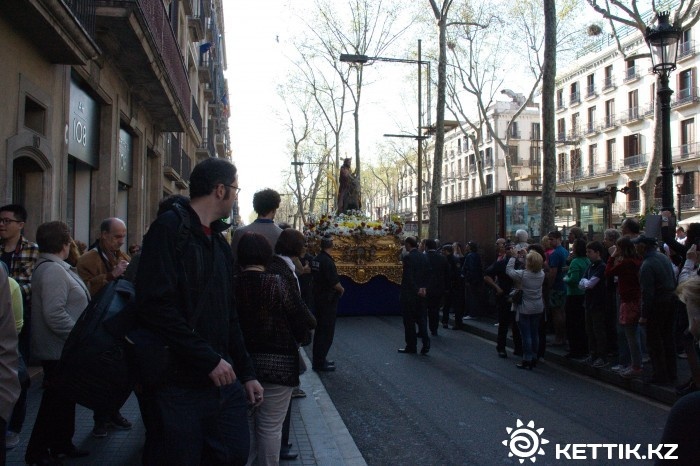 Наверное, это самая знаменитая улица города — Лас Рамблас. Улица невероятно многолюдная. На фотографии народу еще больше, потому как было вербное воскресенье (не знаю, как этот день называется у католиков), и в очень религиозной Испании устраивались шествия. Название улицы можно перевести как "Аллеи", и состоит она из нескольких "рамбл" — Рамбла Цветов, Рамбла Учения, Рамбла Святой Моники, Рамбла Каналетес, Рамбла Капуцинов и Морская Рамбла.