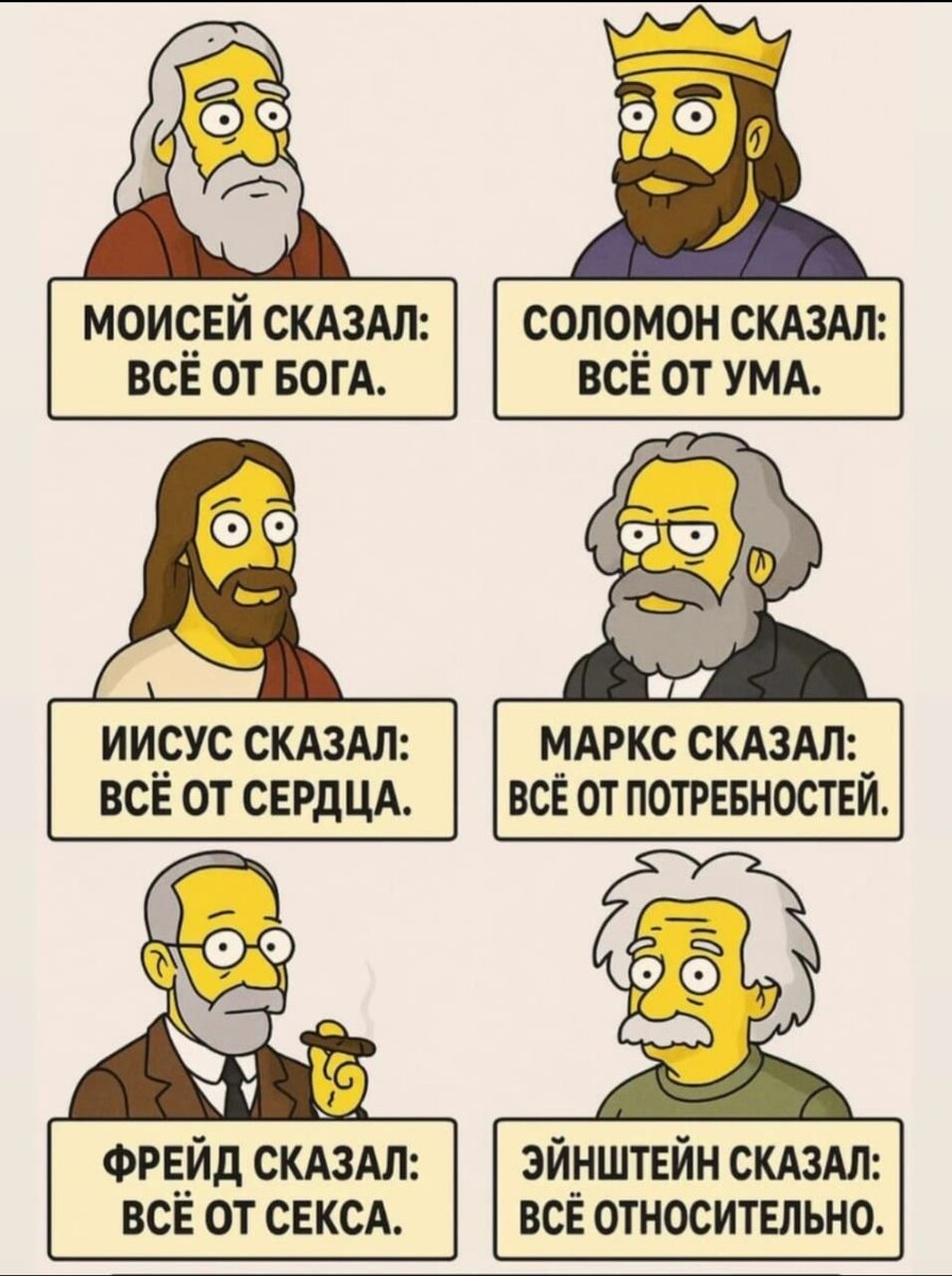 5 высказываний мудрых евреев, которые открывают глаза на истину ☺️Первый мудрый еврей говорил, что у людей всё плохо, потому что у них вот тут (показывая на лоб) всё плохо. Это был Моисей. Все предусмотреть в жизни невозможно. Но можно смягчить острые углы и предотвратить катастрофы. Как? Не доверяться слепо людям, не сравнивать себя с другими, более красивыми, успешными или богатыми, не завидовать им. Не утопать в своих иллюзиях и не расстраиваться, если мечты не сбываются. Иногда это к лучшему. Не все хорошее, что есть в жизни, нам - по плечу. Не держать обиды, не позволять себе ненавидеть. Это разрушающие, разоряющие душу эмоции. ☺️Второй мудрый еврей говорил, что у людей всё плохо, потому что у них вот тут (показывая на сердце) всё плохо. Это был Христос. Жизнь - это не только гонка за материальные блага и бой за место под солнцем. Она тускнеет без милосердия, добра, нежности, сочувствия. Многие из нас готовы эти проявления человеческой души принимать, как само собой разумеюще