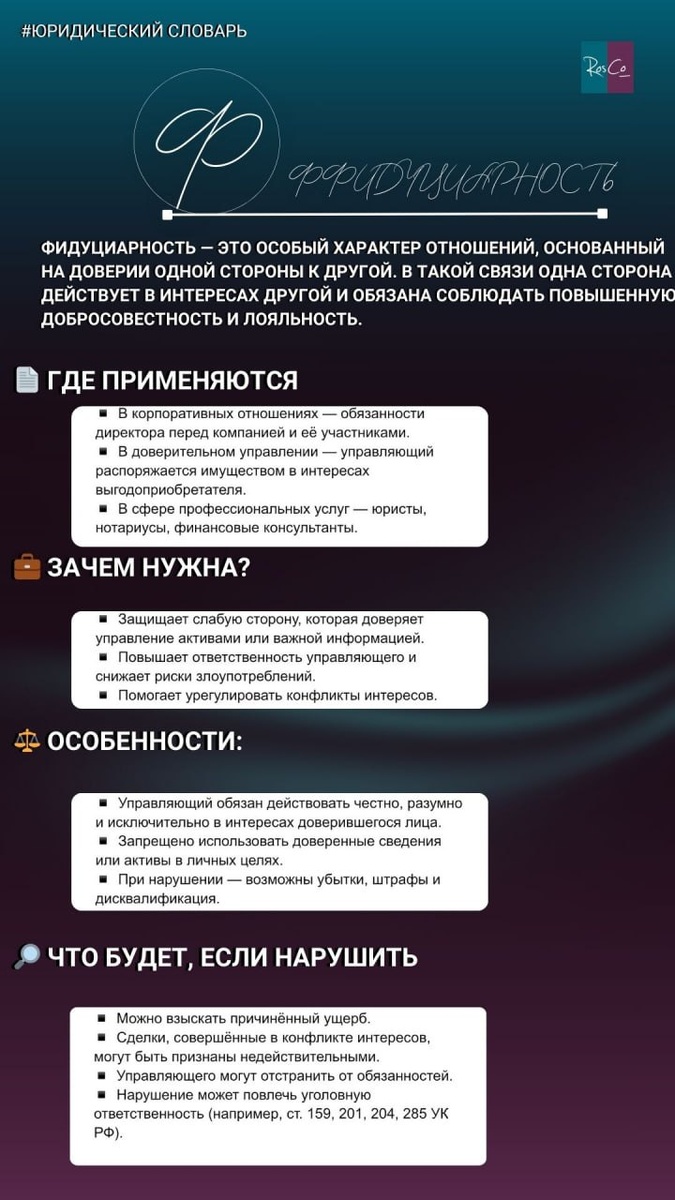 🗒 Ф — Фидуциарность #юридическийсловарь Фидуциарность — это особый характер отношений, основанный на доверии одной стороны к другой. В такой связи одна сторона действует в интересах другой и обязана соблюдать повышенную добросовестность и лояльность. 📄 Где применяется? ▪️В корпоративных отношениях — обязанности директора перед компанией и её участниками. ▪️В доверительном управлении — управляющий распоряжается имуществом в интересах выгодоприобретателя. ▪️В сфере профессиональных услуг — юристы, нотариусы, финансовые консультанты. 💼 Зачем нужна? ▪️Защищает слабую сторону, которая доверяет управление активами или важной информацией. ▪️Повышает ответственность управляющего и снижает риски злоупотреблений. ▪️Помогает урегулировать конфликты интересов. ⚖️ Особенности: ▪️Управляющий обязан действовать честно, разумно и исключительно в интересах доверившегося лица. ▪️Запрещено использовать доверенные сведения или активы в личных целях. ▪️При нарушении — возможны убытки, штрафы и дискв