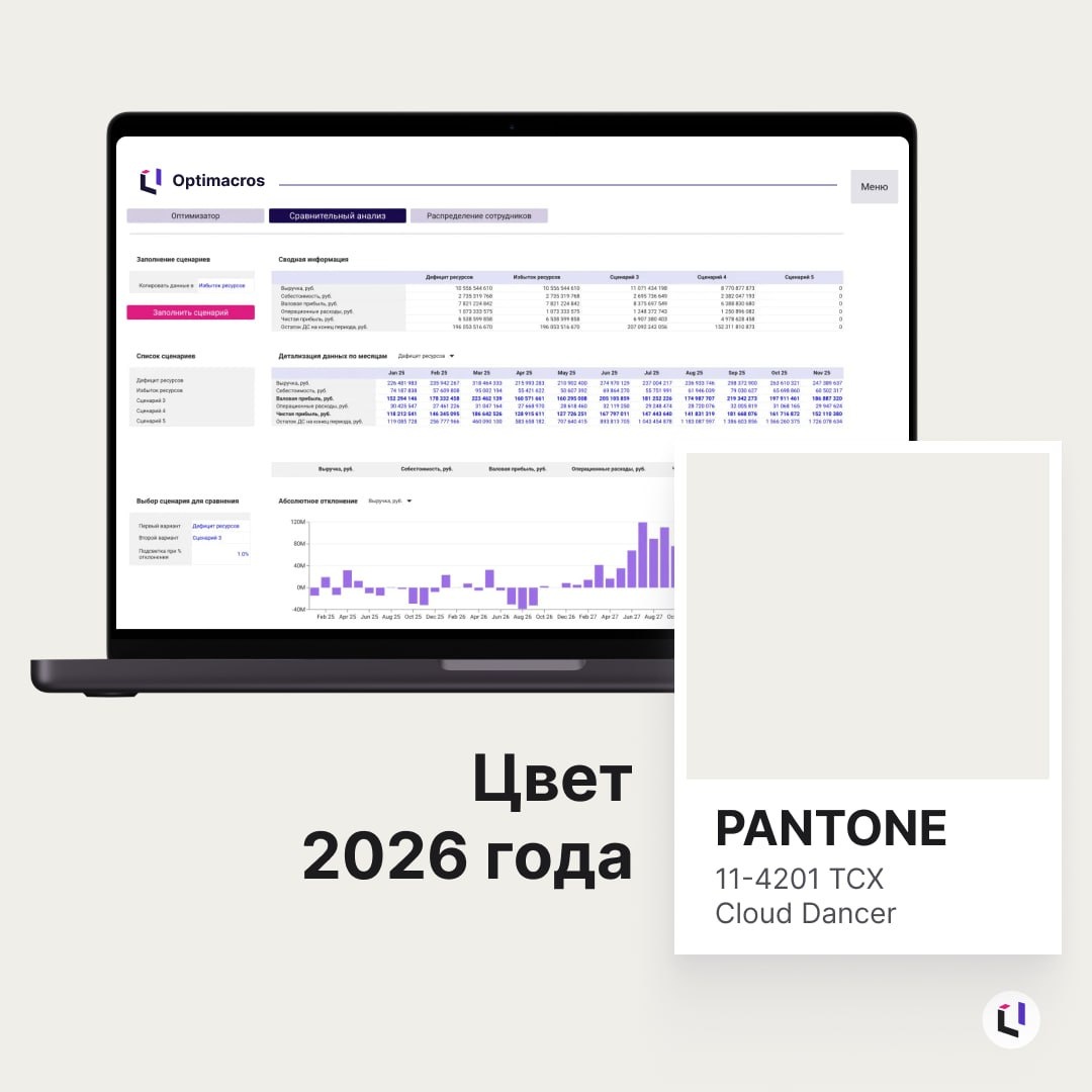 ☁️ Что общего у Optimacros и нового цвета года от Pantone? Институт цвета описывает оттенок Cloud Dancer как «величественный белый», который приносит в жизнь спокойствие, ясность и возвращает ценность тихих размышлений. Эксперты Pantone говорят, что цвет 2026 года наполнен безмятежностью, сосредоточенностью и «позволяет уму блуждать, а творчеству дышать, освобождая место для инноваций». Белый — это про пространство: для идей, действий и роста. Что очень созвучно работе с данными и планами на будущее. Мы в Optimacros искренне надеемся, что наши инструменты дают именно это — спокойствие, свободу от рутины и уверенность в решениях. Цвет года есть, теперь нужен план года. С этим поможет Optimacros 🫡 ________________ Что думаете по поводу цвета 2026? 🕊 — наконец-то база 🐳 — хочется ярких красок!