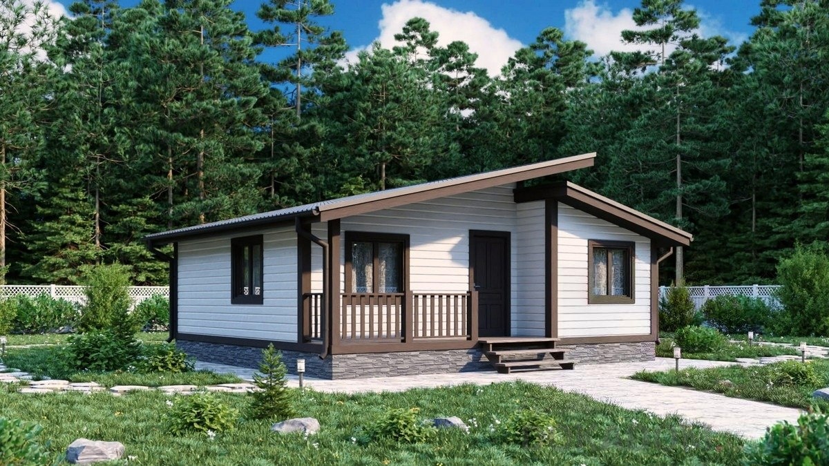 Одноэтажный каркасный дом с разноуровневой крышей, размером 8х6 м с просторным крыльцом