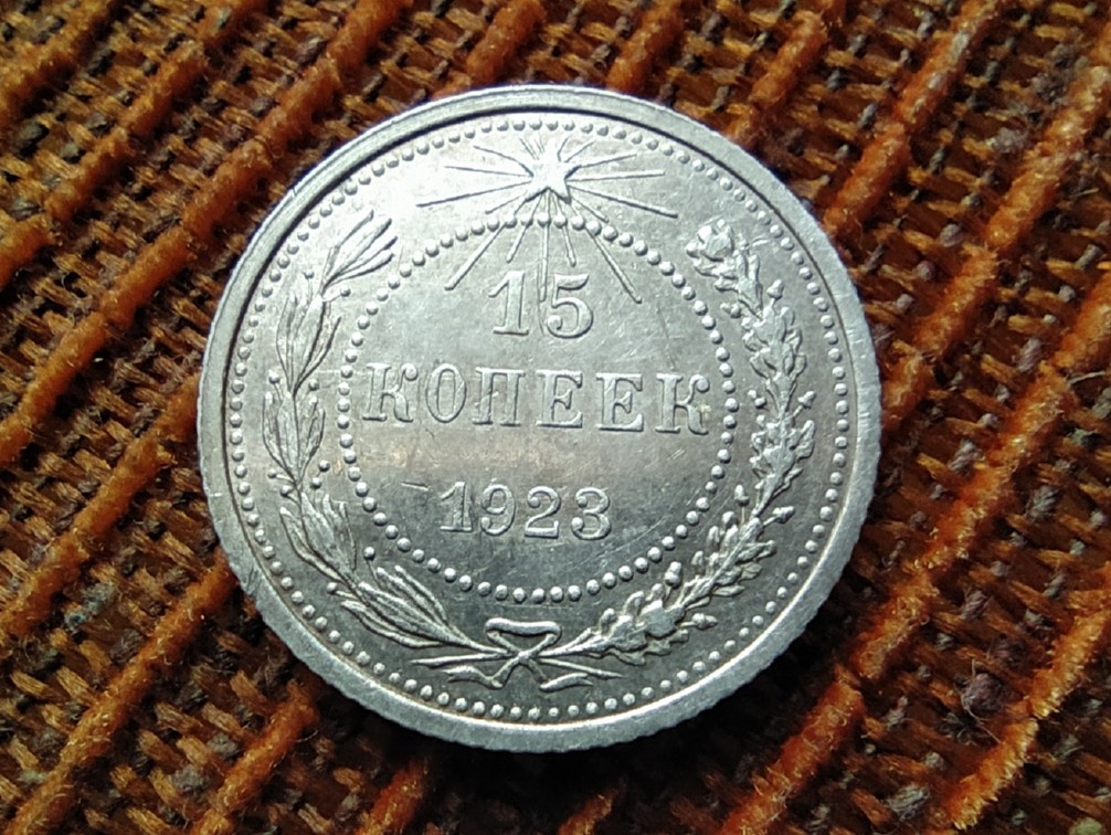 А в данной публикации давайте поговорим про одну из самых дешевых советских серебряных монет - 15 копеек 1923 года. У меня имеется вот такой экземплярчик: Если очень внимательно посмотреть на монету, то можно увидеть, что на ней изображен герб РСФСР - Российская Советская Федеративная Социалистическая Республика. Ну, а мы помним, что с конца 1922 года наша страна уже называлась СССР. Почему же тогда на монете не герб СССР? Я думаю, тут всё просто - нужно было некоторое время, чтобы подготовить оборудование для чеканки монет с новым оформлением. И уже с 1924 года советские монеты выпускались с гербом СССР. Монета - серебряная. Она отчеканена из серебра 500-й пробы (биллон). Вес монеты составляет 2,7 грамма. Легко можно подсчитать, сколько в монете содержится чистого серебра. А я подскажу - 1,35 грамма. На момент публикации стоимость 1 грамма серебра составляет 159 рублей (цены на серебро бьют все рекорды). И опять же - при помощи нехитрого математического действия можно подсчитат