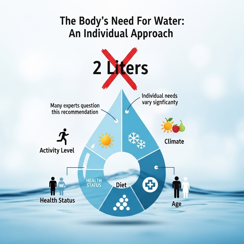 Потребность организма в воде является индивидуальной и не сводится к универсальной норме в два литра в день. Эта рекомендация не имеет достаточного научного обоснования, и многие эксперты подвергают ее сомнению. Индивидуальная норма воды Объем воды, необходимый человеку, зависит от множества факторов: Вес тела: Распространенная формула для расчета — 30-35 мл воды на каждый килограмм веса тела. Например, для человека весом 60 кг это составит около 1,8 литра в день. Пол и возраст: У женщин в среднем процентное содержание воды в организме ниже (52–55%), чем у мужчин (60%), а у пожилых людей оно также уменьшается. Уровень физической активности: При интенсивных тренировках и повышенном потоотделении потребность в воде возрастает. Климатические условия: В жаркую и влажную погоду, а также на больших высотах, потребление воды должно быть увеличено. Состояние здоровья: При некоторых заболеваниях (например, патологиях почек, сердечной недостаточности) врач может рекомендовать индивидуальный объ