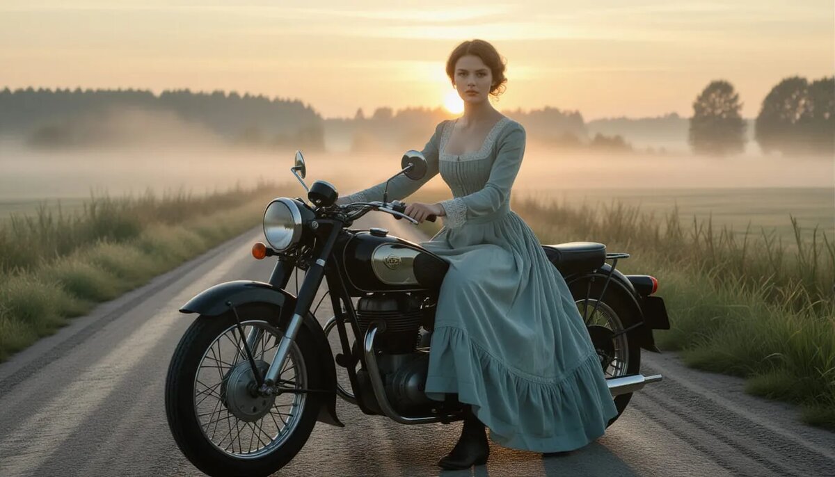Общество в ужасе: «Женщина? На мотоцикле? Да она безумна!» Но она не просто садится на этого "железного коня". Она мчится. Ветер рвёт её вуаль...