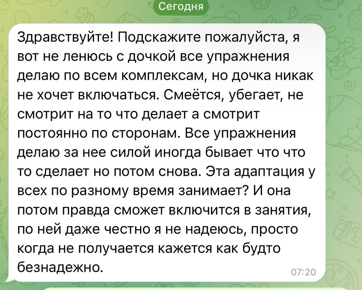 🧩 «Она не включается в занятия… Это нормально?» Очень часто родители говорят: «Мы делаем все упражнения, но дочка не хочет включаться. Смеётся, убегает, не смотрит. Всё приходится делать за неё. Это вообще когда-нибудь изменится?» Да, изменится. И то, что вы замечаете эти моменты — уже первый шаг к пониманию, что происходит внутри ребёнка. 🔬 Почему ребёнок не включается Здесь нет «лени» или «упрямства». Причина глубже — в работе нервной системы. 1. Мозг пока не умеет управлять вниманием. Ребёнку трудно удержать взгляд, сосредоточиться, следовать инструкции. Это не нежелание, а неспособность к произвольной регуляции, которая только формируется. 2. Тело даёт мозгу «смазанную» информацию. Если нарушено восприятие движения и положения тела (вестибулярная, проприоцептивная системы), ребёнок ищет дополнительные ощущения — двигается, смеётся, убегает. Так он регулирует себя. 3. Нет опыта осознанного движения. Пока телесные действия не связаны с результатом, ребёнок просто «не понимает