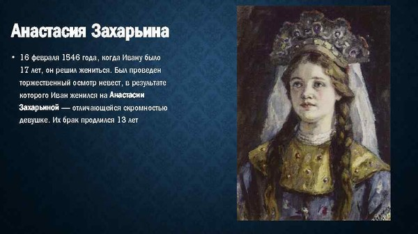 В середине XVI века, когда Русь ещё оправлялась от последствий боярских распрей времён малолетства Ивана IV, судьба преподнесла молодому государю редкий дар - любовь и семейное счастье. В феврале 1547 года, вскоре после венчания на царство, Иван Васильевич избрал в жёны Анастасию Романовну Захарьину‑Юрьеву (ок. 1530–1560) - девушку из старинного боярского рода, впоследствии давшего начало династии Романовых.