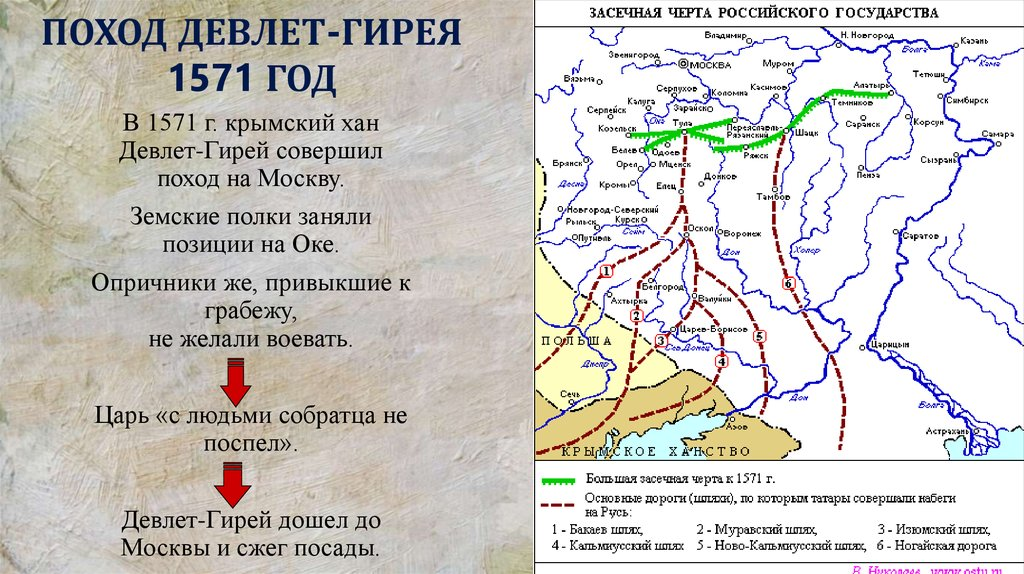 К середине 1570‑х годов Русское государство находилось в тяжёлом положении. Ливонская война (1558–1583) истощала силы: войска увязли на западном фронте, крепости требовали гарнизонов, казна оскудела. На юге же, пользуясь ослаблением Москвы, активизировалось Крымское ханство - вассал Османской империи. Его правитель, Девлет I Гирей, давно вынашивал план масштабного удара по Руси.