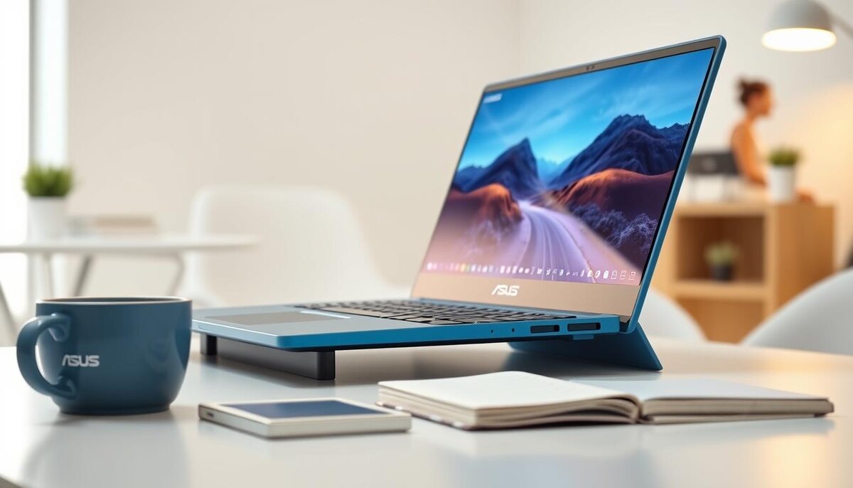 A sleek and modern ASUS X1502VA-BQ845 laptop in Quiet Blue, showcased prominently in the foreground with its shiny, smooth finish reflecting light. The laptop is open, displaying its vibrant screen featuring a colorful desktop background. In the middle ground, a stylish office setting with a minimalist wooden desk, a few tech accessories like a mouse and notepad neatly arranged nearby. The background is softly blurred, featuring a contemporary office environment with light coming through a large window, creating a bright and welcoming atmosphere. The perspective is slightly angled to emphasize the laptop’s design. Illuminate the scene with natural daylight to enhance the laptop's features and convey a professional mood suitable for technology enthusiasts.