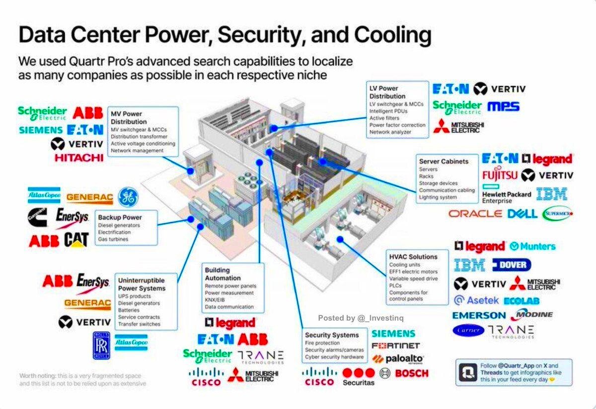 ”. Если дата-центры реально станут долгим трендом, а не историей “как с NFT/блокчейном — взорвали мозг и сдулись”, то я бы смотрел не только на хайповые акции компаний OpenAI и NVIDIA Дата-центр — это мини-город: энергосистема + охлаждение + автоматика + безопасность + железо. И если строек станет в разы больше, бенефициары — вот здесь: Энергоснабжение (MV & LV) — стабилизация и распределение электроэнергии $ABB $ETN $SIEGY $VRT Система бесперебойного энергоснабжения (генераторы и батареи) — когда сеть моргнула, они подхватывают нагрузку мгновенно $GNRC $GE $CAT $ENS Cooling & HVAC — причина, почему сервера не превращаются в тостер 😅 $CARR $TT $EMR $MITSY Server Cabinets & Compute Hardware — стойки, хранение, связь и железо, где “живёт” вычисление $HPE $IBM $DELL $FJTSY Building Automation — датчики, панели, мониторинг, контроль и управление объектом $SCHN $LEGR $CSCO $MIELY Security (Physical + Cyber) — доступ, камеры, пожарка, киберзащита $SIEGY $FTNT $PANW $CSCO Мой взгляд