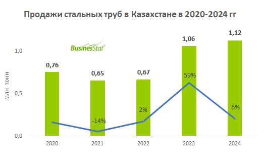 За 2022-2024 гг продажи стальных труб в Казахстане увеличились на 72% и достигли 1,12 млн т.