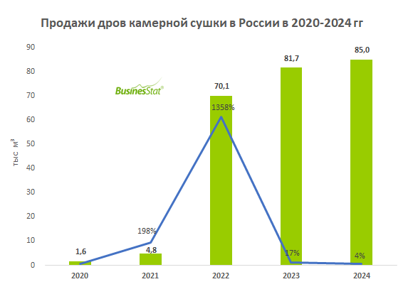 В 2020-2024 г продажи дров камерной сушки в России выросли с 2 до 85 тыс м³.