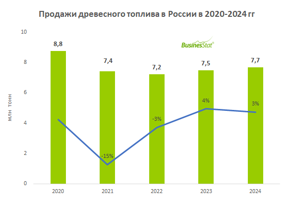 В 2023-2024 гг продажи древесного топлива в России увеличились на 6% до 7,7 млн т.