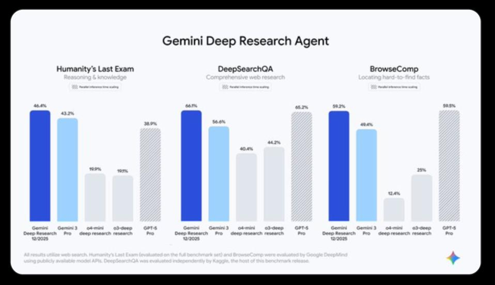 12 декабря 2025 года Google представил сразу три крупных новинки для разработчиков AI-агентов: Deep Research Agent — обновлённый агент для глубоких исследований, теперь впервые доступен сторонним разработчикам. DeepSearchQA — открытый бенчмарк для оценки агентов в сложных задачах поиска и анализа информации. Interactions API — новый унифицированный API для взаимодействия с агентами и моделями Gemini. Deep Research Agent: SOTA-качество и низкая цена Агент построен на Gemini 3 Pro и оптимизирован для долгих цепочек поиска, анализа и генерации отчётов. В тестах Google (HLE, BrowseComp) агент показал SOTA-результаты: 46,4% на HLE (выше, чем Gemini 3 Pro и GPT-5 Pro), а по цене — дешевле GPT-5 Pro в 10 раз. Агент умеет: Искать и анализировать данные в интернете и пользовательских документах. Генерировать структурированные, детально цитируемые отчёты (в т.ч. в формате JSON). Позволяет пользователю контролировать