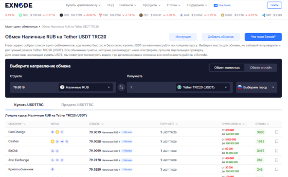 - Используйте агрегаторы. Первое действие — не прямой поиск обменников, а визит на независимый сервис мониторинга, такой как Exnode. Именно здесь вы увидите актуальные курсы от всех точек в вашем городе, что позволит сравнить, где купить USDT TRC20 выгоднее всего.