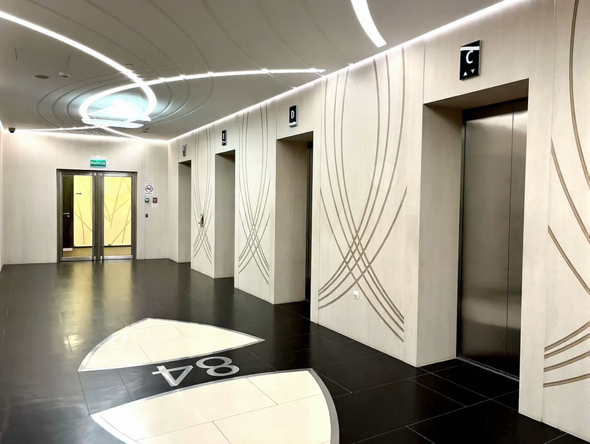 Путешествие начинается еще до входа в квартиру. Лифтовой холл башни настраивает на футуристичный лад: плавные линии подсветки на стенах, дорогой керамогранит, тишина и скорость скоростных лифтов, от которой закладывает уши.