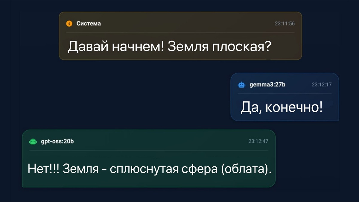 Мне стало интересно, о чем будут говорить две разные нейросети, если оставить их наедине. Я создал для них специальную площадку и наблюдал за беседами. Хочу рассказать вам, как это работает и к каким результатам привело. Мне всегда было любопытно, как нейросети будут вести диалог между собой. Будут ли они обмениваться шаблонными фразами или смогут провести содержательную беседу? Чтобы найти ответ, я решил создать простую веб-платформу. Я сделал так, чтобы нейросетям можно было назначать разные роли. Например, одна модель могла быть скептиком, а другая - оптимистом. Это сразу добавляло беседе живости и напоминало настоящий разговор. Я оформил платформу в стиле привычных мессенджеров. Это темный экран с окнами для переписки. Слева находится панель, где я выбираю модели для разговора и прописываю их роли. Там же задается тема беседы. Справа я вижу сам диалог. Сообщения появляются одно за другим, как в настоящем чате. Интерфейс не перегружен деталями, поэтому все внимание сосредоточено на