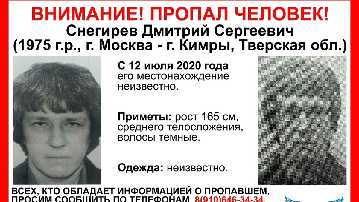 Волонтеры тверского поискового-спасательного отряда "Сова" ищут пропавшего Дмитрия Сергеевича Снегирева 1975 года рождения. Мужчина может находиться как в Москве, так и в городе Кимры Тверской области. Местонахождение пропавшего неизвестно с 12 июля 2020 года. Приметы: рост 165 см, среднего телосложения, волосы темные. Одежда: неизвестно. Информацию о пропавшем нужно сообщать в отряд по телефонам: 8 (910) 646-34-34 и 8 (904) 014-12-34 Читайте также: Опубликованы фото с места подъема фрагментов бомбардировщика в Тверской области Мы в МАХ: присоединяйтесь!