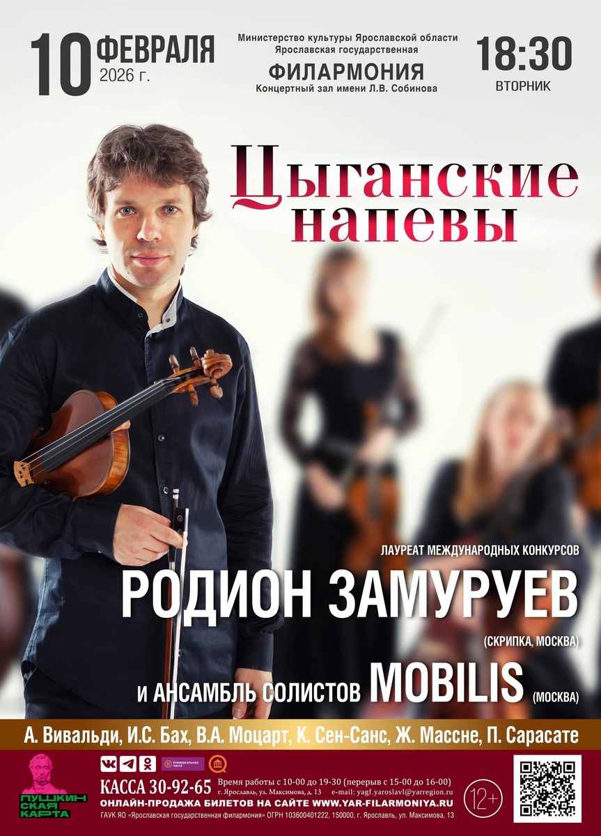 📢 10 февраля 2026 года состоится яркое музыкальное событие - концерт «Цыганские напевы». На сцену выйдут лауреат международных конкурсов Родион Замуруев и ансамбль солистов «Mobilis» - коллектив, заслуживший признание не только в России, но и на международной арене. Семь талантливых музыкантов, каждый из которых является признанным мастером своего дела, под руководством Родиона Замуруева создают уникальное звучание, в котором сочетаются мощь оркестровой палитры и изысканный мелодизм. Слушателей ждут страстные мелодии, искрящийся огонь и виртуозное исполнение, воплощённые в программе, которая объединит классические шедевры и колоритные цыганские мотивы. 👏👏👏 https://yar-filarmoniya.ru/afisha/view.php?af_id=5950