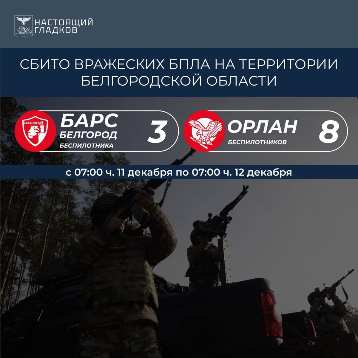Оперативная сводка по сбитым БПЛА в Белгородской области за сутки За период с 07:00 11 декабря до 07:00 12 декабря подразделения «БАРС-Белгород» и «Орлан» ликвидировали 11 вражеских беспилотников. Силы подразделений продолжают круглосуточно нести службу, обеспечивая защиту воздушного пространства Белгородской области. ❕ Жесть Белгород - подписаться 📸 Прислать новость: @predlozhka_zhest_bg