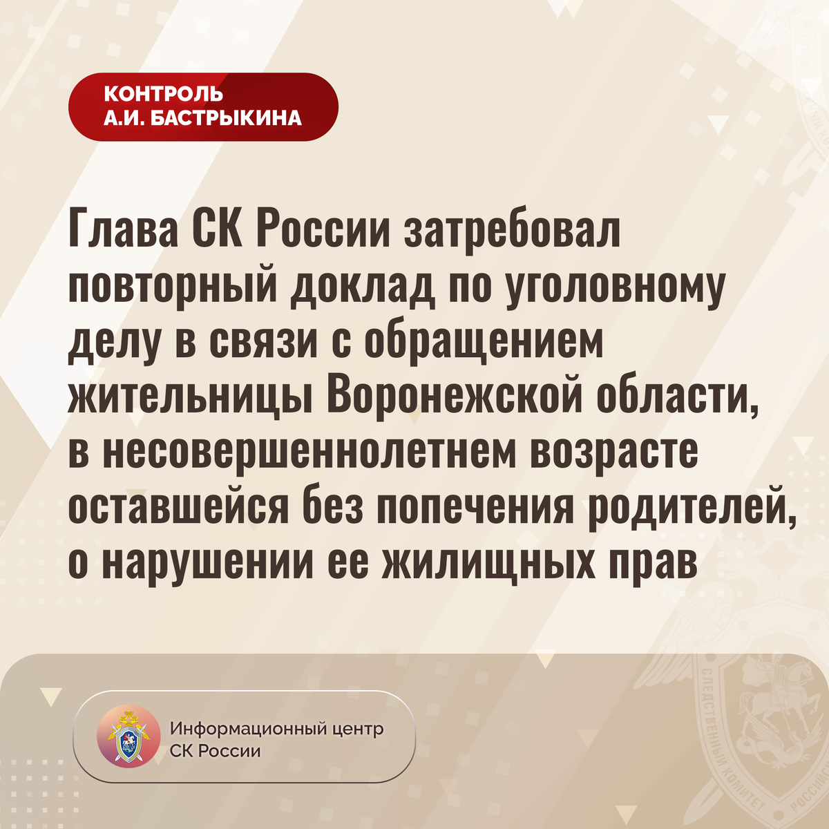 Глава СК России затребовал повторный доклад по уголовному делу в связи с обращением жительницы Воронежской области, в несовершеннолетнем возрасте оставшейся без попечения родителей, о нарушении ее жилищных прав В приёмную Председателя СК России А.И. Бастрыкина «ВКонтакте» обратилась жительница города Воронежа, в несовершеннолетнем возрасте оставшаяся без попечения родителей, по вопросу длительного непредоставления ей положенного по закону жилья. В 2012 году девушка принята на учет лиц, подлежащих обеспечению жилыми помещениями. Несмотря на наличие вступившего в законную силу судебного решения, до настоящего времени мер к реализации прав заявительницы не принято. Многочисленные обращения в различные инстанции результатов не принесли. В СУ СК России по Воронежской области расследуется уголовное дело, по которому ранее А.И. Бастрыкин поручал представить доклад. Председатель Следственного комитета Российской Федерации Александр Иванович Бастрыкин затребовал у руководителя СУ СК России по