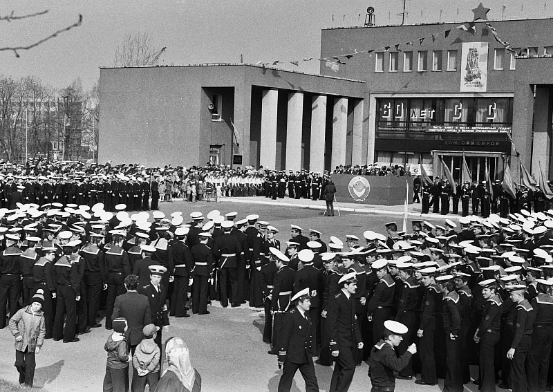 Дом офицеров в Палдиски. Военнослужащие "Школы механиков" - залегендированное название Учебного Центра подготовки экипажей атомных подводных стратегов. Где то среди гражданских тогда бродит бывший эстонский эсэсовец. Для нас вражина, а сейчас герой для талопонцев. Кстати, по теме, как то приснилось, что стою, то ли дежурным по кораблю, то ли, ещё курсантом, дневальным по роте. Вдруг заходит Леонид Ильич Брежнев в окружении маршалов и адмиралов. Всё окаменело. А я лапу к уху и докладываю: "Товарищ генеральный секретарь КПСС Советского Союза...". А он, нахмурился, пальцем погрозил и говорит:- "Нет, Серёжа, Союза! Про... вы его с товарищами". А потом заплакал и поцеловал меня в макушку.