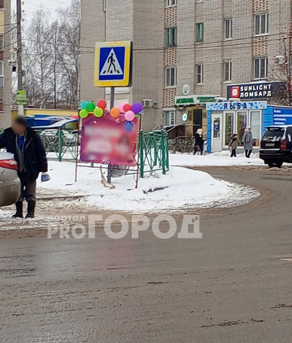Возле ТД "Экспресс" на Ельниковском проезде рекламный щит установили прямо на дорожный знак пешеходного перехода