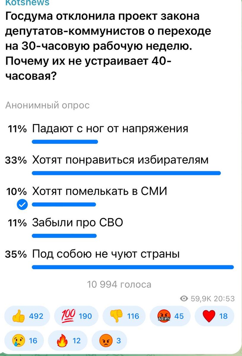 ⚡️⚡️⚡️ 35 процентов подписчиков считают, что некоторые в Госдуме не чуют под собой страны