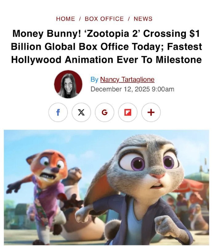 «Зверополис 2» стал новым рекордсменом среди анимационных фильмов, собрав миллиард долларов всего за 17 дней при бюджете в 150 миллионов