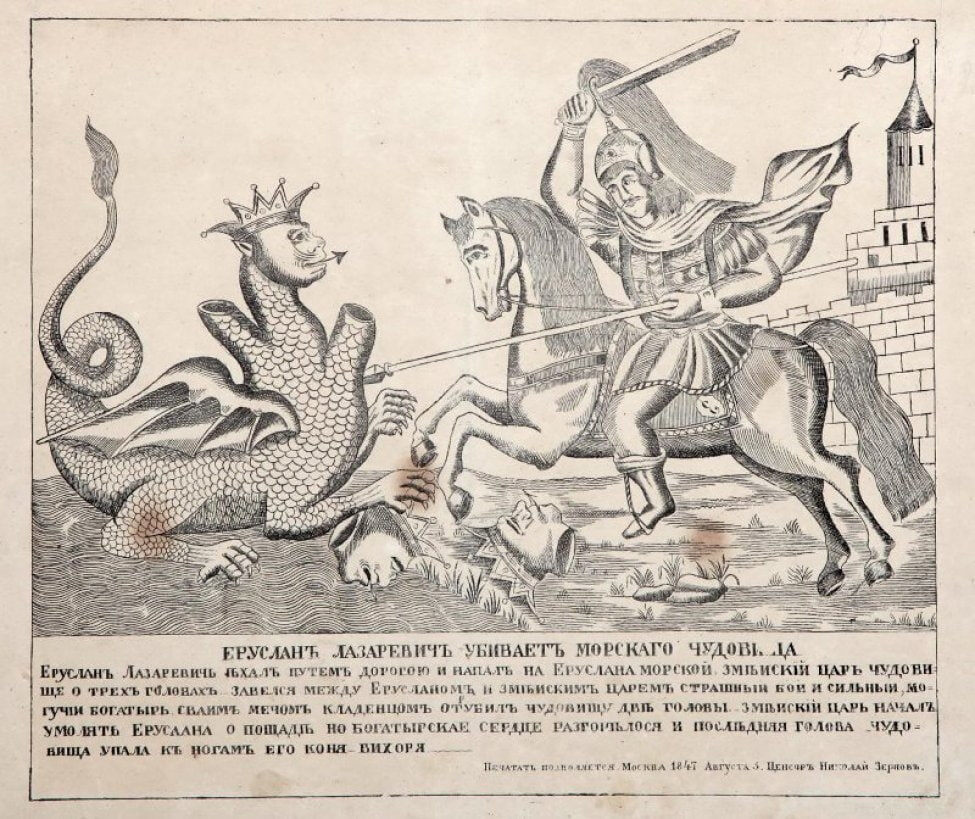 Еруслан Лазаревич. Лубки XVIII века. Богатырь Еруслан Лазаревич встречает "морского змейского царя" и срубает ему три головы. По другой версии, он приезжает на чудище к городу, где его встречает прекрасная царевна Анастасия Вохрамеевна