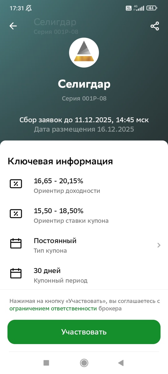 Привет всем! Решила символически поучаствовать ещё в первичном размещении облигаций Селигдар 001Р-08 с постоянным купоном (всё-таки идёт цикл снижения ставки). Сбор заявок проходил до 14:45 мск 11.12.2025. Ориентир доходности - 16,65-20,15%. Ориентир ставки купона: 15,5-18,5%. RUSBONDS.RU - ПАО "Селигдар" установило финальный ориентир ставки купона облигаций серии 001Р-08 на уровне 18% годовых. Это вполне хороший показатель. Купонный период - 30 дней. Срок обращения - 2,5 года. Амортизация отсутствует. Эмитент - ПАО "Селигдар", полиметаллический холдинг, одна из ведущих в стране золотодобывающих компаний. Рейтинг - ruA/A+.ru/АА-|ru| (ЭкспертРА/НКР/НРА). Заявку подала всего на одну облигацию. Пусть будет для разнообразия, параметры неплохие, но есть более интересные для меня бумаги. Дата размещения - 15 декабря 2025. Ещё о недавних размещениях облигаций: Не индивидуальная инвестиционная рекомендация. Мой Телеграм-канал, присоединяйтесь: Поддержать автора донатом: Всем спасибо з