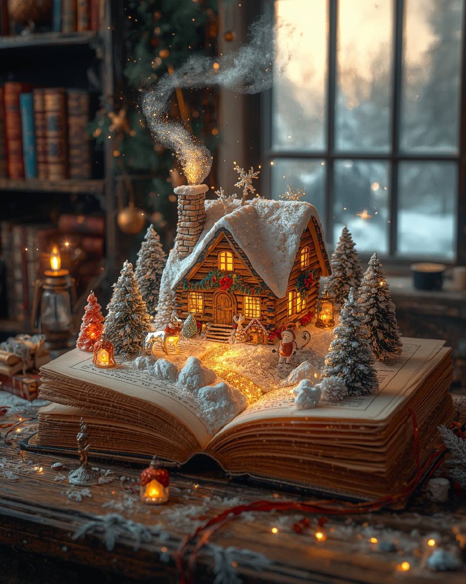 Представьте: вы открываете старинную книгу — и вдруг из её страниц рождается целая рождественская вселенная… 🪄 Перед вами — магическая сцена, где крошечный праздничный мир оживает на деревянных страницах. Тёплый свет из окон домика, искрящийся снег, миниатюрные сани из хрусталя и мерцающие звёзды в воздухе… Это не просто картинка — это приглашение в сказку, где каждый элемент дышит волшебством Рождества. Заглядывайте в детали: здесь и леденцовые фонари, и заснеженные ели с золотыми украшениями, и даже крошечные снеговики на столе. Пусть эта атмосфера согреет ваше сердце в предпраздничные дни! ✨ #Рождество #Волшебство #ПраздничнаяАтмосфера