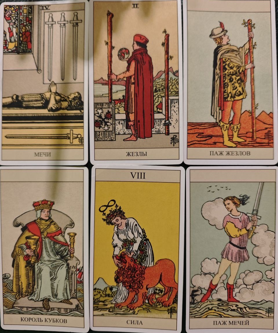 Карты: Мечи 4 • Жезлы 2 • Паж Жезлов • Король Кубков • Сила • Паж Мечей