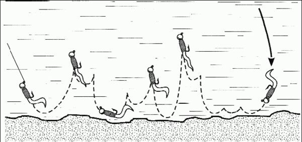 Привычная для многих «ступенька» в тяжелом джиге, как и в любом другом, конечно, работает, но это уже давно не идеал. С годами я пришел к выводу, что гораздо эффективнее выполнять проводку не вращением катушки, а движением удилища. Самый простой вариант «короткие рывки» выглядит так: вращая катушку, я быстро подаю удилище в сторону лежащей на дне приманки, затем останавливаю катушку и делаю первую короткую (20–35 см) подтяжку удилищем, которая отрывает приманку от дна. Подтяжка должна быть плавной, но с постепенным ускорением. После остановки приманка набирает небольшую инерцию, на леске появляется легкий провис, и через мгновение я делаю вторую подтяжку — скорее даже резкий рывок, отрывочный, но более короткий. Движения выполняю довольно быстро, приманка подпрыгивает над дном по своеобразной Z-образной траектории. Активный хищник просто не может устоять перед подобными движениями.