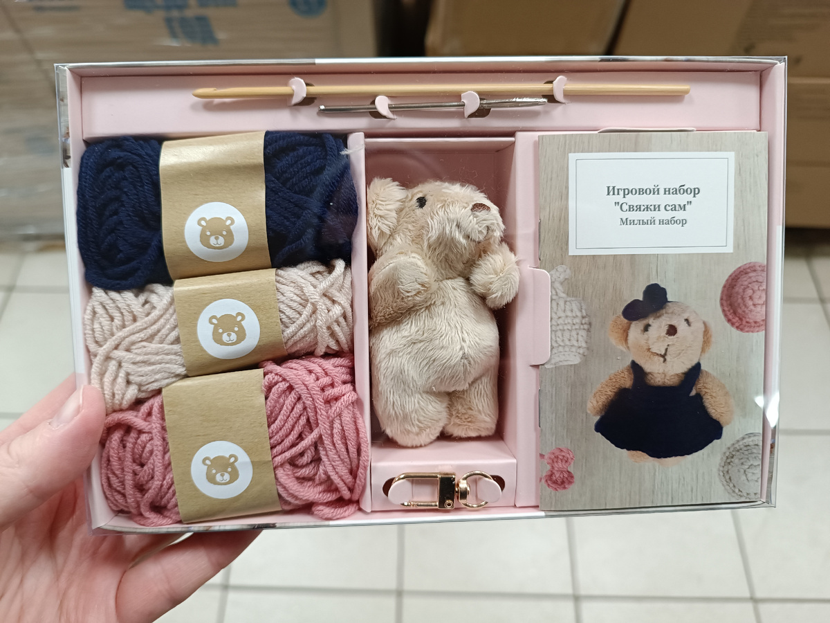 Это к сведению, а сам обзор сегодня начну с таких вот милых наборов - "Свяжи сам" для девочек. Можно так обучать вязать платья животным, которые в коробке. Крючки в комплекте, нитки и игрушка.