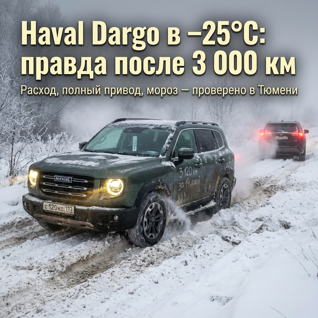 Haval Dargo позиционируют как «народный внедорожник». Но как он ведёт себя не в Крыму, а в сибирской стуже при –25°C? За 3 000 км я проверил всё: от запуска утром до выезда из сугроба. Это не пресс-тур и не «обзор с парковки». Это реальный тест в условиях, близких к вашим, если вы живёте в Тюмени, Новосибирске или Хабаровске. Условия теста: не лаборатория, а жизнь С 25 ноября по 10 декабря 2025 года я проехал на Haval Dargo Prestige ровно 3 120 км по маршрутам, которые повторяют ежедневную реальность большинства: Температура: от –18°C до –27°C (среднесуточная –22°C) 65% - город: короткие поездки 5–15 км (магазин, работа, школа) 35% - трасса: маршрут Тюмень–Новосибирск (в обе стороны) Машина: 2.0T (224 л.с.), 9-ступенчатый автомат, полный привод iAWD, пробег с нуля Авто - официально собранное в Туле, ПТС РФ, гарантия 7 лет. Расход топлива: заявлено vs реальность Завод обещает 8,9 л/100 км в смешанном цикле. В реальности: Город (–22°C, короткие поездки): 13,8–14,3 л/100 км Трасса (90