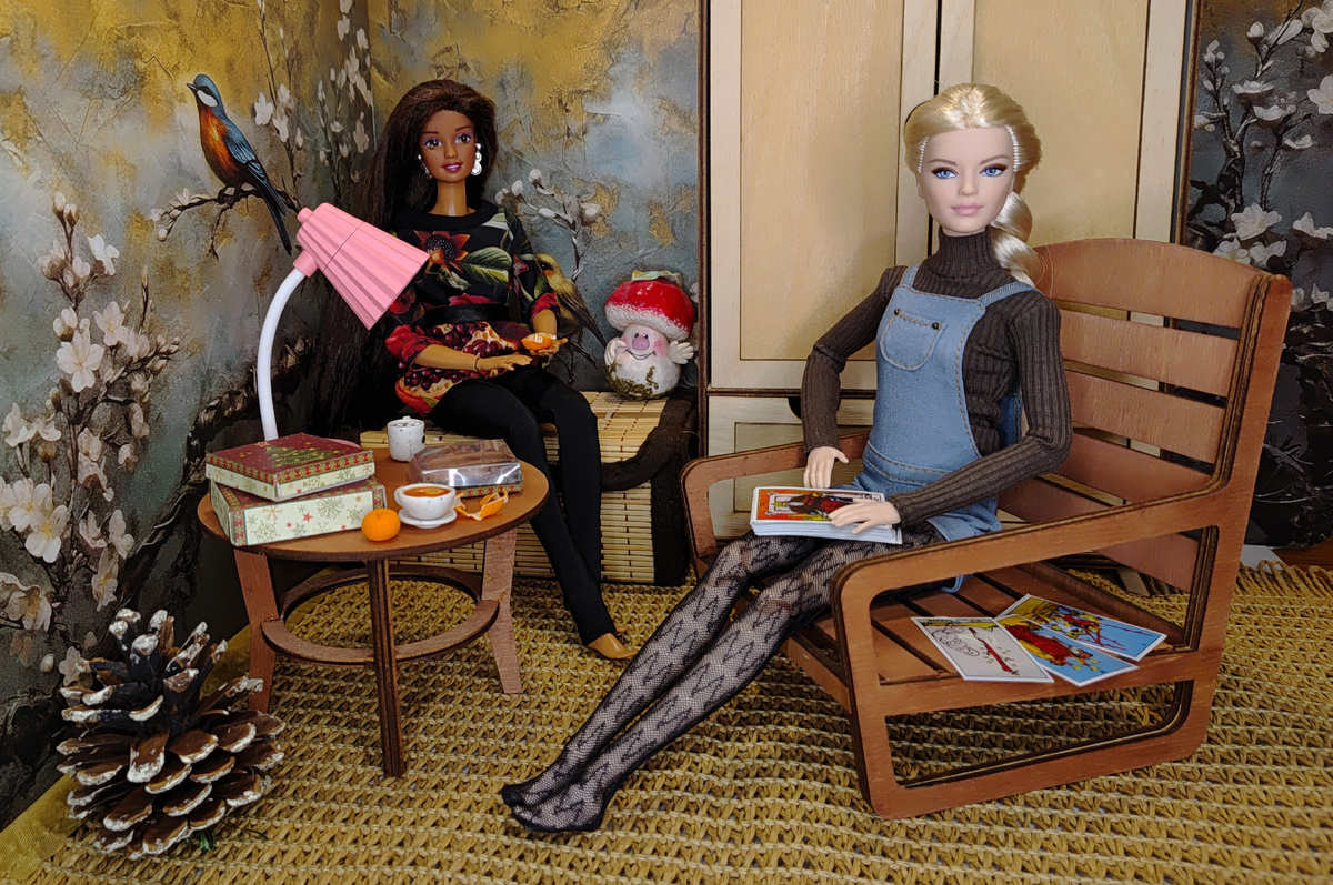 У меня получилась спонтанная фотосессия. Я купила настольную лампочку в кукольный дом. Хотела вам показать. Но фотографировать одну лампочку мне показалось скучным занятием. Я принялась обустраивать локацию... и вуаля... Девчонки подтянулись: - Давай вечернее чаепитие устроим, пряников пожуем, картишки раскинем! Давайте, милые. Давно мы с вам не болтали о своём, о девчачьем. За карты в моем кукломире отвечает Виктория. Она умная, спокойная и вдумчивая барышня. Хорошо понимает карты, Таро её слушаются. Девочки решили спросить, когда же наконец в их мире появится хоть один мужчина!!!??? Заскучали без мужского внимания, без сильных рук, без горячих поцелуев. Запрос у девушек очень конкретный: сильный, смелый, чтобы слово держал... не пил, не курил и цветы всегда дарил. И что же нам сказали карты? Виктория достала три... положила их на креслице.. и принялась толковать. Тереза терпеливо ждёт, чистит мандаринку. Но тут прибежали чьи-то дети. Понятия не имею чьи они. Лор моей кукол