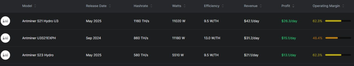 На первом месте Antminer S21 Hydro U3 с производительностью 1160 Th/s и ежедневной доходностью $26,3.