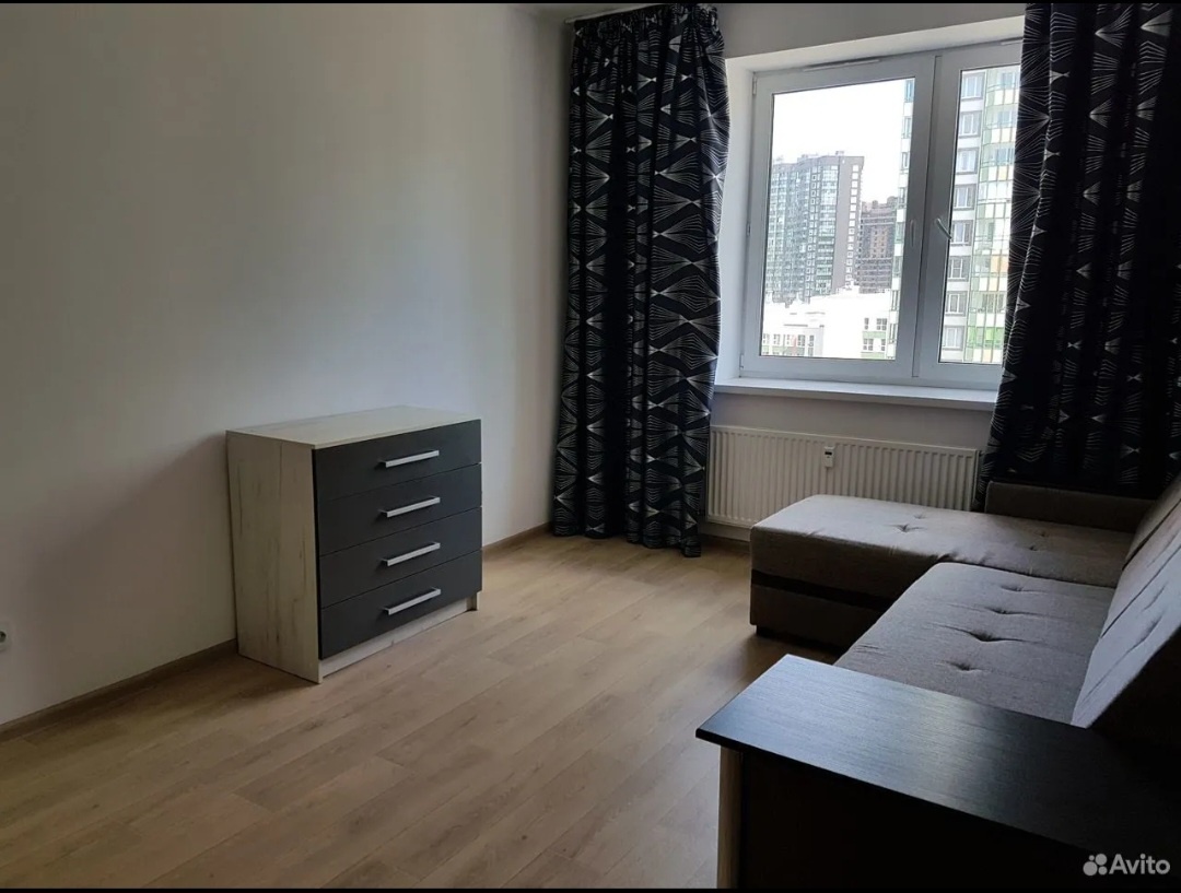 Летом 2024 года вдвоем с дочкой мы вернулись в нашу однокомнатную квартиру, которая до этого сдавалась 4 года. Надо отметить, что квартиранты у меня были добросовестные и аккуратные. За исключением естественного износа, все было в порядке. Ремонт же от застройщика и изначально эконом-вариант. Отделку я затрагивать все же не стала, хотя мысли такие были. Но это совсем другие усилия и деньги. Сейчас рада, что не ввязалась в ремонт, ведь остались бы мы в этом случае без второй квартиры. И сегодня речь пойдет об основной комнате. Комната 18 м2, из которых 3 м2 занимает гардеробная. Здесь был один комод, угловой диван, шторы, люстра и установлена гардеробная система. В таком виде квартира сдавалась и в такую мы вернулись (фото с Авито): С собой привезли только стеллаж, напольную лампу, детский столик со стульчиком. Детский комод отдали родители из своей квартиры, это был самый первый Ксюшин комод, он с пеленальным столиком. Комод стоит в гардеробной. Здесь вещи ещё не до конца разобр