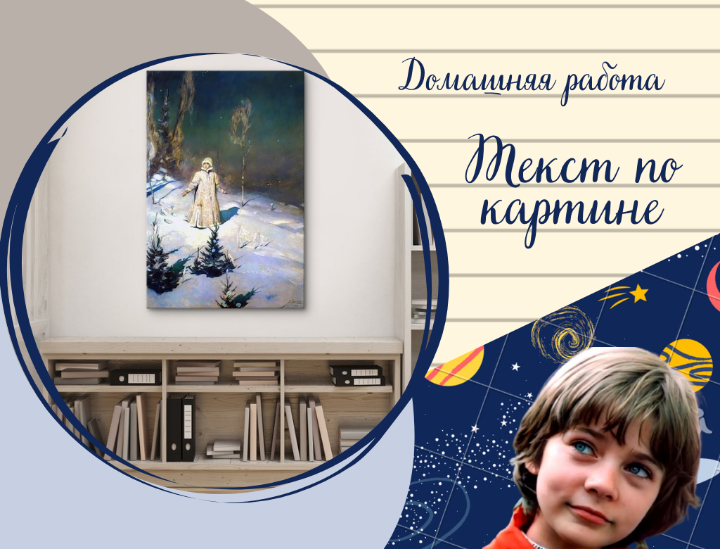 Великолепное произведение сказочной и немного новогодней тематики. Виктора Васнецова можно назвать сказочником в живописи. Он мастерски, точно и подробно, изображал в своих работах героев русских легенд и сказок. Не является исключением и знаменитая «Снегурочка», которой уже более ста лет восхищаются посетители Третьяковской галереи. Задание взято из учебника по русскому языку для третьего класса, часть 1. Авторы – В. П. Канакина, В. Г. Горецкий, 2023 год. Программа – Школа России. Задание 242 Рассматриваем картину: Виктор Михайлович Васнецов, "Снегурочка", 1899 г. Как выполнить задание Отвечаем на вопросы по картине: ° На полотне мы видим опушку ночного леса, посреди которой стоит молодая девушка. Сюжет картины – первое появление сказочной Снегурочки в мире людей. Автор посвятил свою работу этому волшебному событию, поэтому картина называется «Снегурочка». ° Фон картины – зимний лес. Силуэты деревьев с голыми ветками, слегка припорошенных снегом, пышные сугробы, на которых виден каж